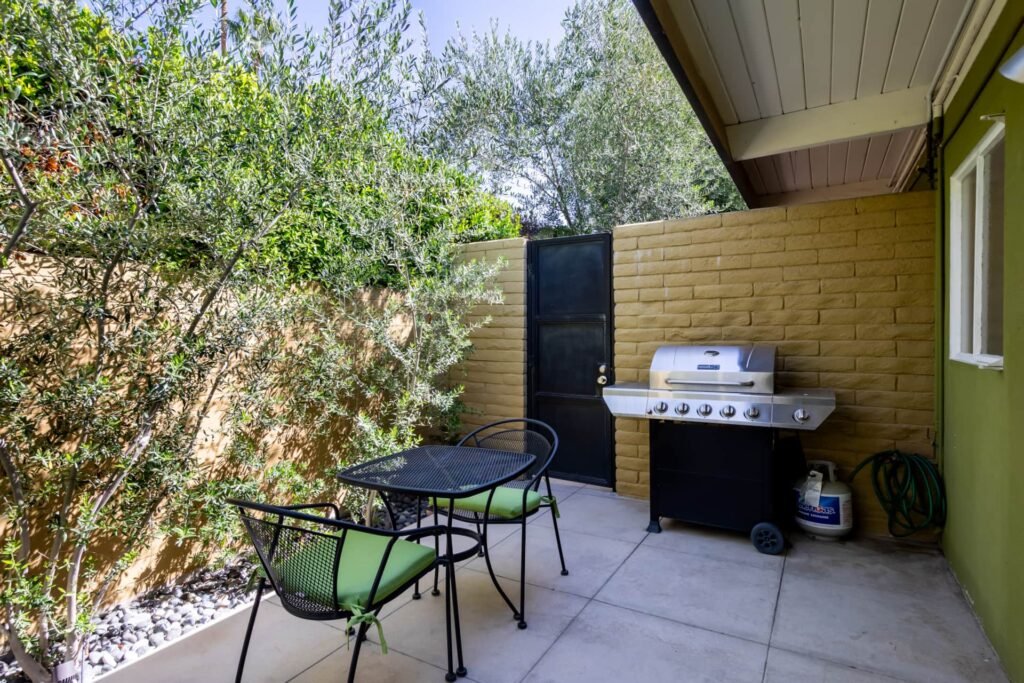 The bedroom opens to a private patio accessed through expansive 12 foot sliding doors with screens. There you will find a small dining table and gas grill ready for your dining pleasure.